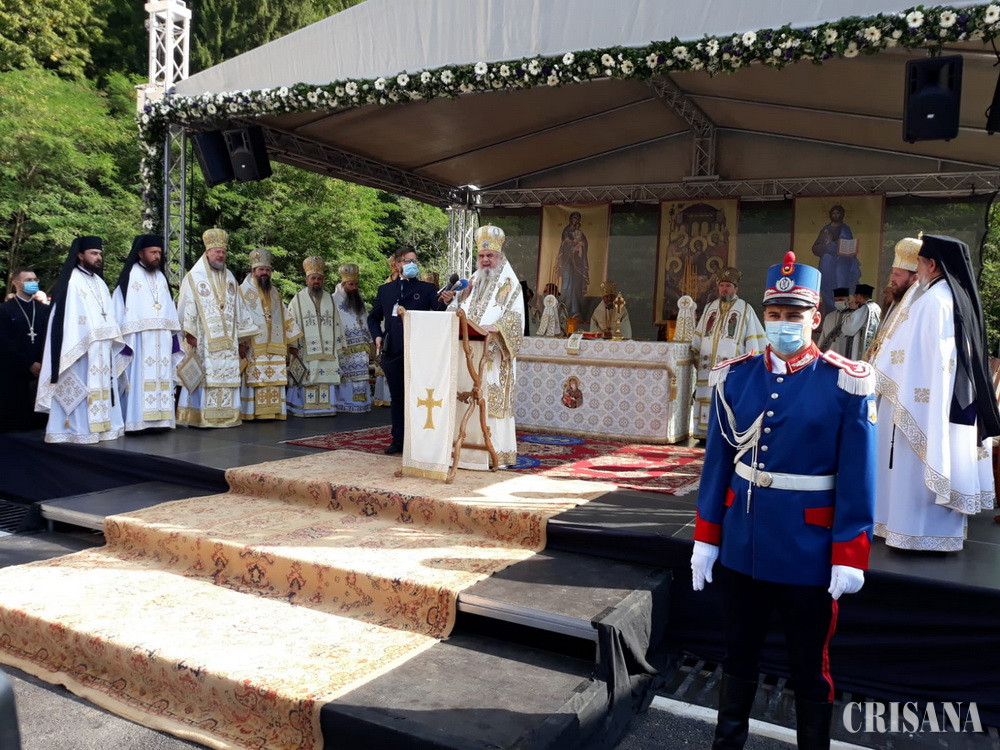 Conform protocolului stabilit, începând cu ora nouă, Preasfințitul Părinte Sofronie, Episcopul Oradiei, a oficiat Sfânta Liturghie, pe o scenă amenajată în vecinătatea noului lăcaș de cult, după care, de la ora unsprezece, Preafericitul Părinte Daniel, Patriarhul Bisericii Ortodoxe Române, alături de ierarhii invitați, a săvârșit slujba de târnosire a noii biserici cu hramul Adormirea Maicii Domnului. Ritualul obișnuit a fost modificat, Patriarhul rostind cuvântul de învățătură și înmânând distincțiile pregătite pentru cei care au sprijinit ridicarea bisericii – printre care starețul Mihail Tărău și senatorul Cornel Popa – înainte de oficierea slujbei propriu-zise, care urma să aibă loc în biserică, unde nu putea avea acces decât un număr restrâns de persoane.