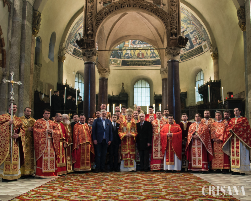 Prof. doctor academician Ioan Aurel Pop, rectorul Universităţii Babeş-Bolyai Cluj-Napoca, a avut o amplă expunere despre Marea Unire de la 1918, iar pe această temă prof. doctor Cesare Alzati, de la Universitatea Catolică Sacro Cuore din Milano, a avut o intervenţie prin care şi-a manifestat simpatia, dar şi cunoştinţele despre poporul român. PSS Virgil Bercea, episcopul greco-catolic de Oradea, a subliniat rolul exponenţial pe care l-a avut Biserica Greco-Catolică Română atât în 1918, cât şi în anii premergători, printr-o activitate spirituală şi culturală în rândul românlor din Transilvania. Imnul Naţional, cântat de orădeanul Ovidiu Lazăr, împreună cu toată asistenţa, a făcut ca spiritul românesc să fie simţit la cele mai înalte cote, chiar departe de ţară. Îmbucurător este faptul că la acest moment semnificativ au participat şi reprezentaţii cultelor majoritare româneşti, ortodox, greco-catolic şi romano-catolic.