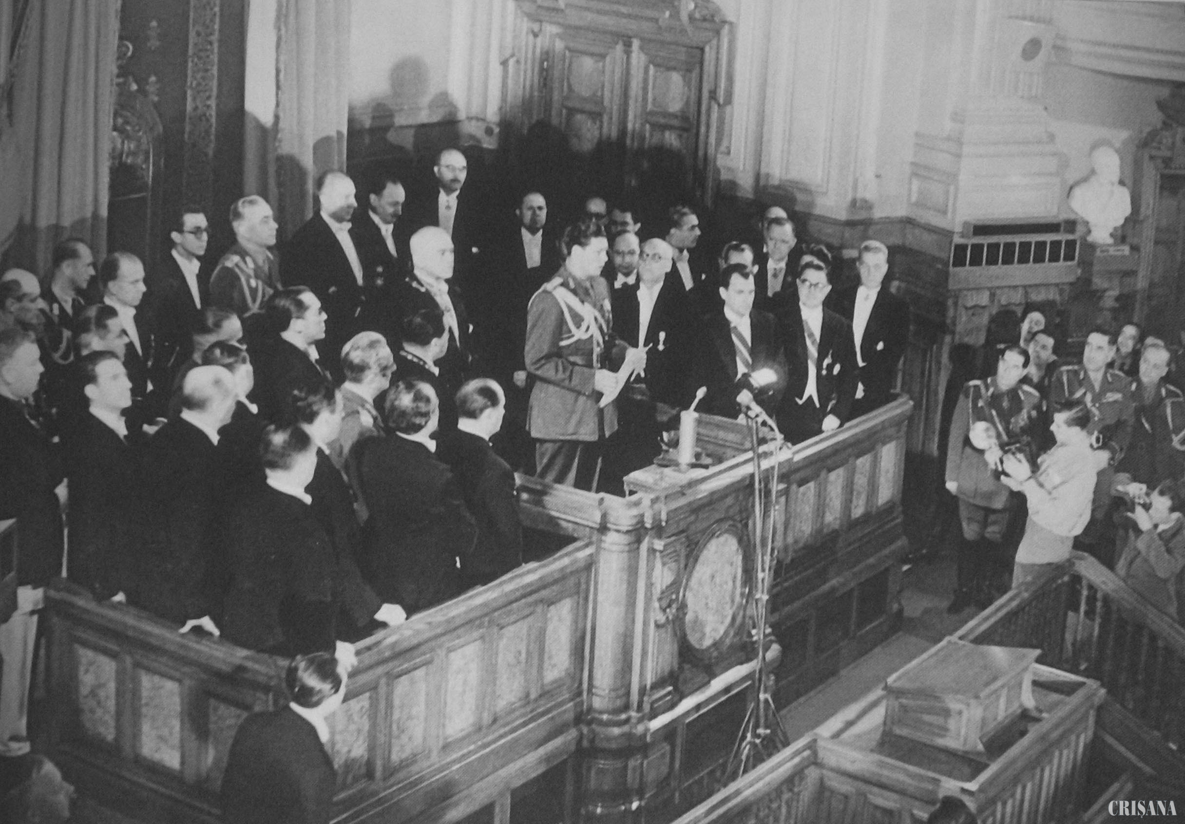 În ziarul Scânteia din numărul special dedicat Anului Nou 1948 este descrisă în stilul caracteristic proclamarea Republicii Populare de către Adunarea Deputaţilor convocată în sesiune extraordinară în aceeaşi zi. „Tribunele, balcoanele, părăsesc de astă-dată rigurozitatea parlamentară şi entuziasmul popular se deslănţuie cu o forţă greu de stăpânit. Evenimentul este prea măreţ pentru ca oamenii să se mai poată reţine. Când, în incinta Parlamentului răsună pentru prima dată cuvintele "REPUBLICA POPULARĂ", guvernul şi întreaga Adunare se ridică în picioare şi aclamă furtunos. Tribunele, balcoanele îşi unesc entuziasmul şi, timp de câteva minute, Parlamentul român îşi exprima bucuria faţă de noua formă de Stat a României." (Va urma)