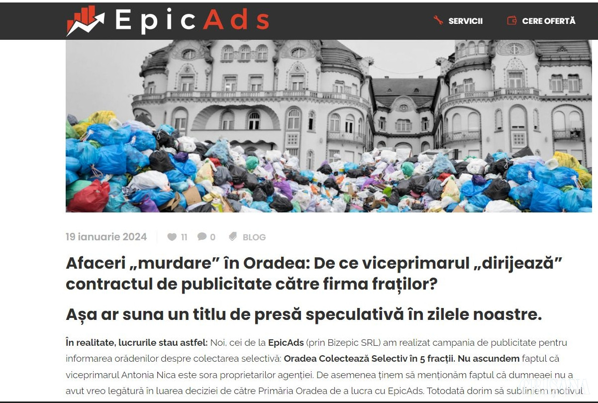 A început duminica trecută să circule, sponsorizat, un articolaș stupid pe rețelele sociale, care a stârnit numeroase semne de întrebare. Începea cu titlul „Afaceri murdare în Oradea...”, urmată apoi de spovedania jafului în stilul gulerelor albe. Firma fraților viceprimăriței Nica a primit un mizilic de 56.000 de lei de la Primăria Oradea pentru a realiza campania de publicitate pentru informarea orădenilor despre colectarea selectivă. Firma a fost aleasă pe ochii ei frumoși, iar băieții au muncit de s-au spetit pentru un comision de 16.200 de lei, restul banilor intrând în pușculița Google și Facebook. Apoi un amănunt, acolo, aruncat cam neglijent. Separat de campania asta, s-au dat bani și pentru presa scrisă locală. „Presa locală” fiind de fapt doar două entități: ebihoreanul.ro, care a încasat 13.600 lei, și bihon.ro, care a primit 16.000 de lei, pentru extraordinarul efort de a publica câte patru articole gata scrise. La așa scoruri, ar păli de invidie chiar și Andreea Esca!