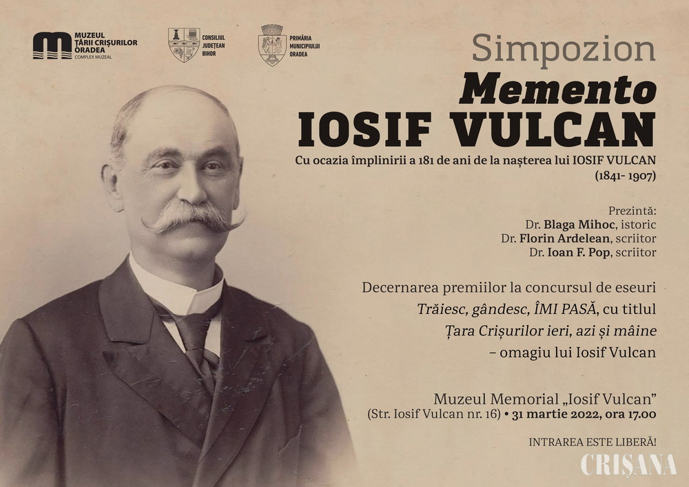 În data de 31 martie se împlinesc 181 de ani de la nașterea lui Iosif Vulcan (1841- 1907), prilej cu care Muzeul Țării Crișurilor Oradea - Complex Muzeal, în parteneriat cu Consiliul Județean Bihor și Primăria Municipiului Oradea, organizează un simpozion dedicat cărturarului bihorean.