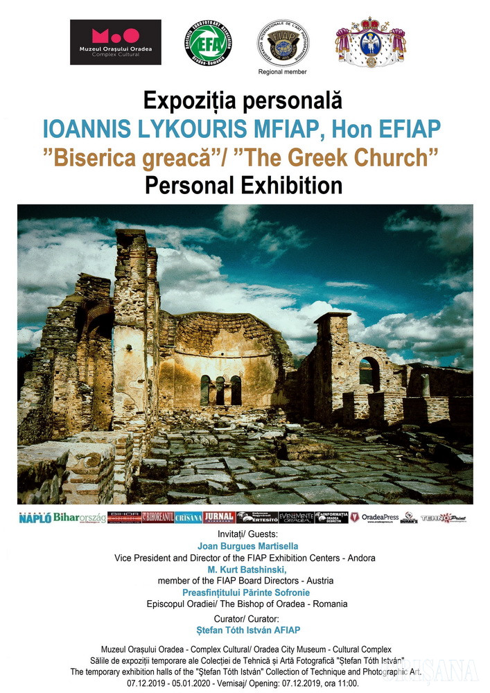 Reputatul artist fotograf grec se prezintă în fața publicului orădean cu expoziția de artă fotografică intitulată Biserica Greacă, formată din 72 de fotografii color. Această expoziție are trei părţi componente. Prima e dedicată diferitelor stiluri de biserici ortodoxe grecești. În ciuda fundalului sărăcăcios al unora, tavanul boltit, pereții pictați și altarul demonstrează, în partea a doua, ceea ce au toate în comun. În partea a treia sunt prezentate activitățile din interiorul sau din exteriorul bisericii în timpul ceremoniilor religioase, cu atenție deosebită asupra graniței dintre credință și tradiție, care dispare încetul cu încetul. Vernisajul expoziției va avea loc sâmbătă, 7 decembrie, ora 11.00, în prezența autorului. La eveniment va participa PS Sofronie, episcopul ortodox al Oradiei, precum și artiștii fotografi: Joan Burgues Martisella, vicepreședintele Federației Internaționale de Artă Fotografică, directorul Centrelor Expoziționale (Andora), Nagy Lajos (România), Georg S. Holzmann, ex-președintele Federației Artiștilor Fotografi din Germania și alte personalități de marcă ale artei fotografice din Europa. Lucrările vor fi prezentate de către criticul de artă dr. Ramona Novicov, iar momentele muzicale vor fi oferite de către corul Liceului Teologic Ortodox Episcop Roman Ciorogariu din Oradea.