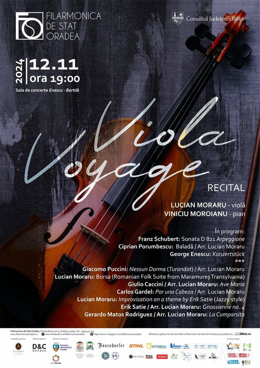 Printr-un repertoriu foarte atractiv, astăzi, 12 noiembrie, în sala de concerte „Enescu – Bartók” a Filarmonicii de Stat Oradea, începând cu ora 19.00, Lucian Moraru, la violă, și Viniciu Moroianu, la pian, vă vor purta într-o călătorie muzicală prin diferite epoci și stiluri muzicale diverse. De la sonata Arpeggione, de Franz Schubert, o lucrare cu un farmec vienez subtil plină de pasaje de virtuozitate, urmată de emblema lirismului instrumental românesc, Balada, de Ciprian Porumbescu, partea I, va culmina cu piesa de concert pentru violă și pian a celui mai cunoscut dintre compozitorii români, George Enescu.