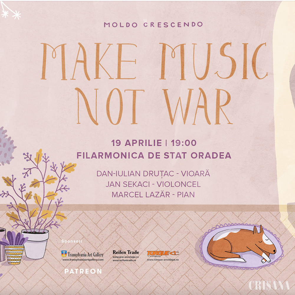 „Make Music, Not War” îi aduce în această seară, pe scena Filarmonicii orădene, pe Dan Iulian Druțac (vioară), Jan Sekaci (violoncel) și Marcel Lazăr (pian), care vor interpreta lucrările Trio „Gypsy”, de J. Haydn, Trio „Ghost” op. 70 nr. 1, de L. van Beethoven, Trio Andante con Moto, de E. Grieg și Trio nr. 2 op. 67, de D. Shostakovich.