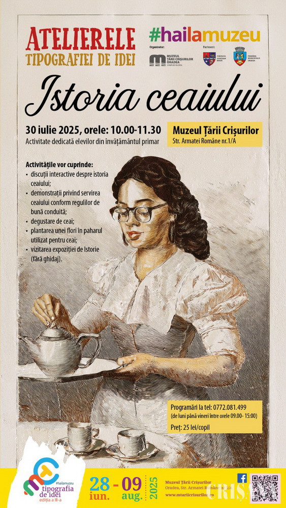 Muzeul Țării Crișurilor Oradea – Complex Muzeal organizează, cu sprijinul Consiliului Județean Bihor și al Primăriei Municipiului Oradea, în cadrul programului estival „Tipografia de idei | #hailamuzeu”, ediția a III-a, atelierul de educație muzeală „Istoria ceaiului”. Activitatea este dedicată elevilor din învățământul primar și va cuprinde: discuții interactive despre istoria ceaiului; demonstrații privind servirea ceaiului conform regulilor de bună conduită; degustare de ceai; plantarea unei flori în paharul utilizat pentru ceai; vizitarea expoziției de Istorie (fără ghidaj).