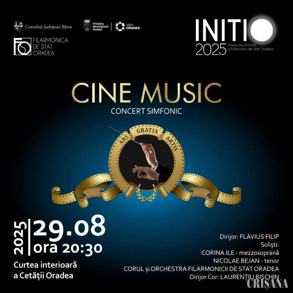 Concertul CineMusic va fi dirijat de Flavius Filip, iar lucrările vor prinde glas prin vocile Corului și Orchestrei Filarmonicii de Stat Oradea, precum și ale mezzosopranei Corina Ile și tenorului Nicolae Bejan. Muzica de film va cuprinde curtea interioară a Cetății Oradea în data de 29 august, de la ora 20.30.