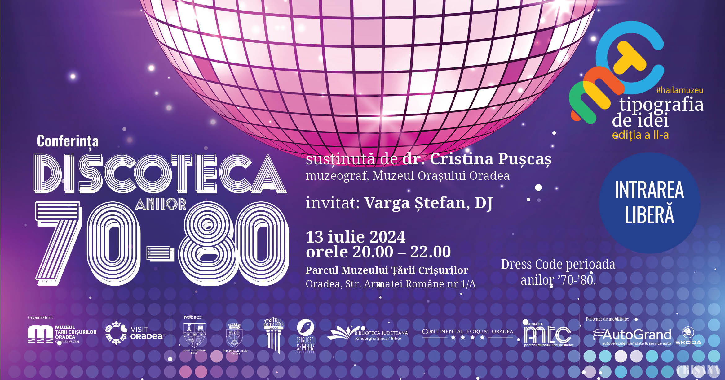 Sâmbătă, 13 iulie, de la ora 20.00, în parcul Muzeul Țării Crișurilor (str. Armatei Române nr. 1/A), va avea loc conferința „Discoteca anilor ’70-’80”.