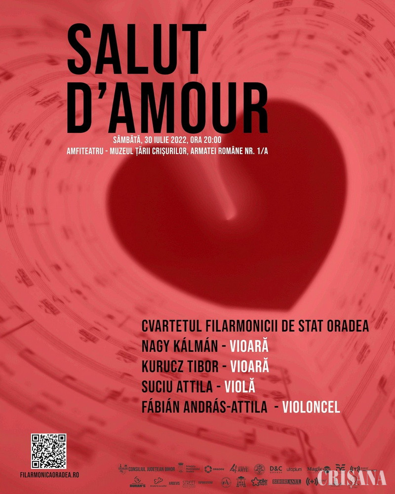 Sâmbătă, 30 iulie, de la ora 20.00, în amfiteatrul Muzeului Țării Crișurilor, str. Armatei Române nr. 1/A, va avea loc un concert susținut de Cvartetul Filarmonicii de Stat Oradea, intitulat „Salut D’Amour”.
