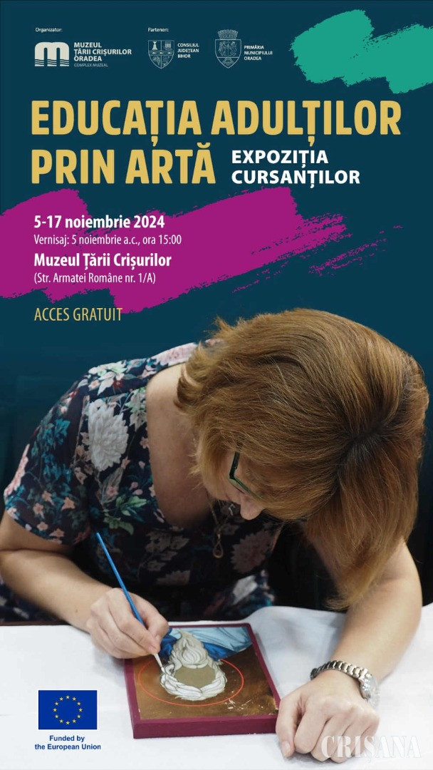 Muzeul Țării Crișurilor Oradea - Complex Muzeal organizează, cu sprijinul Consiliului Județean Bihor și al Primăriei Municipiului Oradea, vernisajul expoziției „Educația adulților prin artă: expoziția cursanților”.