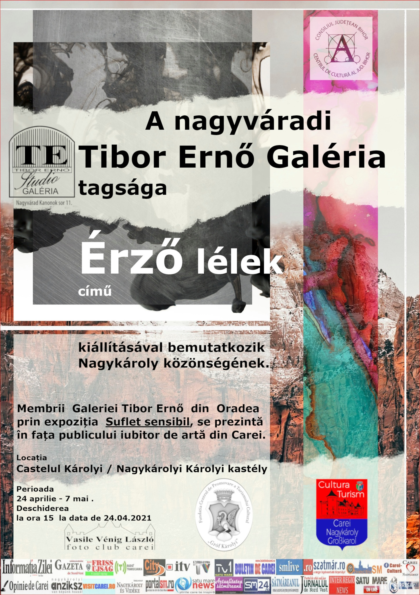 Centrul de Cultură al Județului Bihor, împreună cu Galeria ,,Tibor Ernő” și Castelul Károlyi din Carei, organizează mâine, 24 aprilie, de la ora 15.00, în incinta castelului Károlyi din Carei, vernisajul expoziției de pictură „Suflet sensibil”. Evenimentul reunește pictura, poezia și muzica sub semnătura talentatului instrumentist Thurzó Sándor József și a poetului Fórián Andrea.