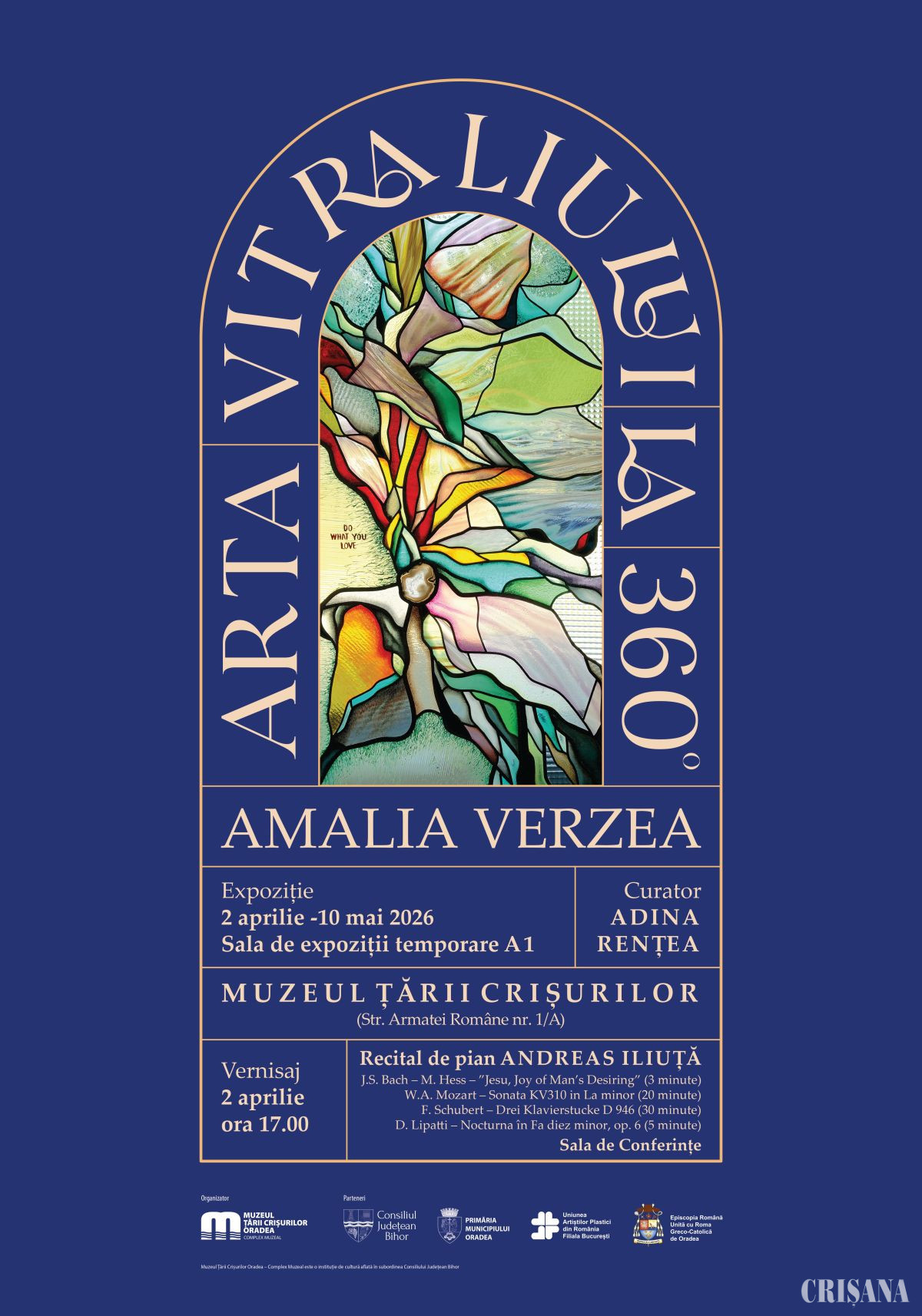 Expoziția, intitulată „Arta vitraliului la 360°”, semnată de artista Amalia Verzea, una dintre cele mai importante figuri ale vitraliului contemporan, va fi vernisată joi, 2 aprilie, ora 17.00, la Muzeul Țării Crișurilor.