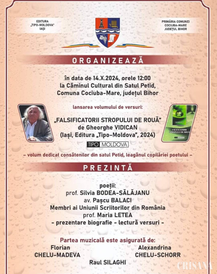 La Căminul Cultural din satul Petid (comuna Cociuba Mare), a avut loc lansarea volumului de poezii „Falsificatorii stropului de rouă”, volum scris de poetul Vidican Gheorghe, fiu al satului și cetățean de onoare al comunei Cociuba Mare din 2013.