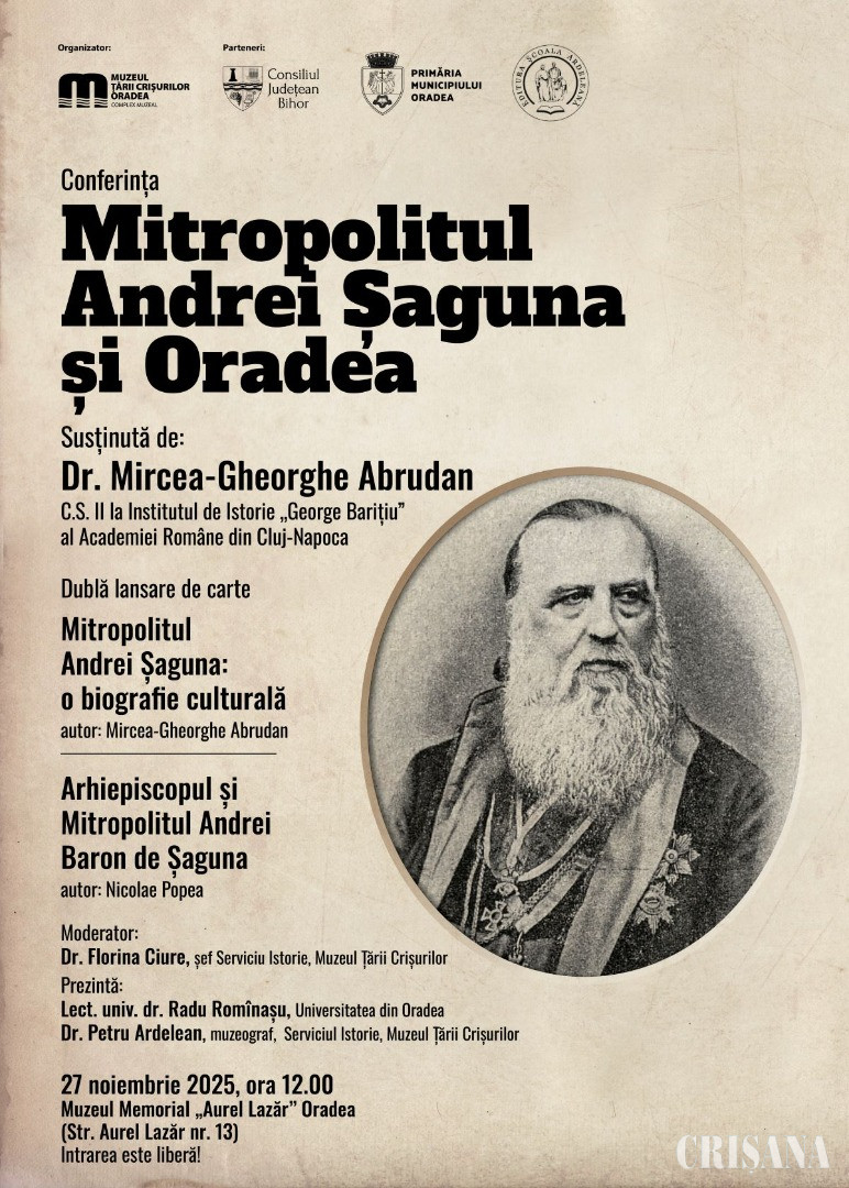 Muzeul Ţării Crişurilor Oradea – Complex Muzeal organizează, în parteneriat cu Consiliul Județean Bihor, Primăria Municipiului Oradea și Editura Școala Ardeleană, conferința „Mitropolitul Andrei Șaguna și Oradea”, susținută de dr. Mircea-Gheorghe Abrudan, C.S. II la Institutul de Istorie „George Barițiu” al Academiei Române din Cluj-Napoca. Evenimentul va avea loc joi, 27 noiembrie, de la ora 12.00, la Muzeul Memorial „Aurel Lazăr” Oradea (str. Aurel Lazăr nr. 13).