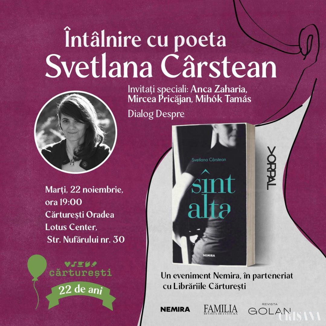 Editura Nemira, în colaborare cu revistele Familia și Golan, invită publicul cititor marţi, 22 noiembrie, la o întâlnire deosebită cu poeta Svetlana Cârstean, la librăria Cărturești din Lotus Center.