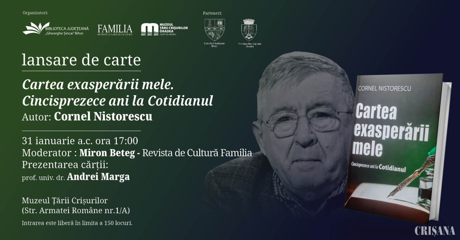 Evenimentul va avea loc miercuri, 31 ianuarie, de la ora 17.00, la sediul Muzeului Țării Crișurilor (str. Armatei Române nr.1/A), în sala de conferințe, în prezența autorului, și va fi moderat de către Miron Beteg. Prezentarea cărții va fi făcută de către filosoful și omul politic român, prof. univ. dr. Andrei Marga.