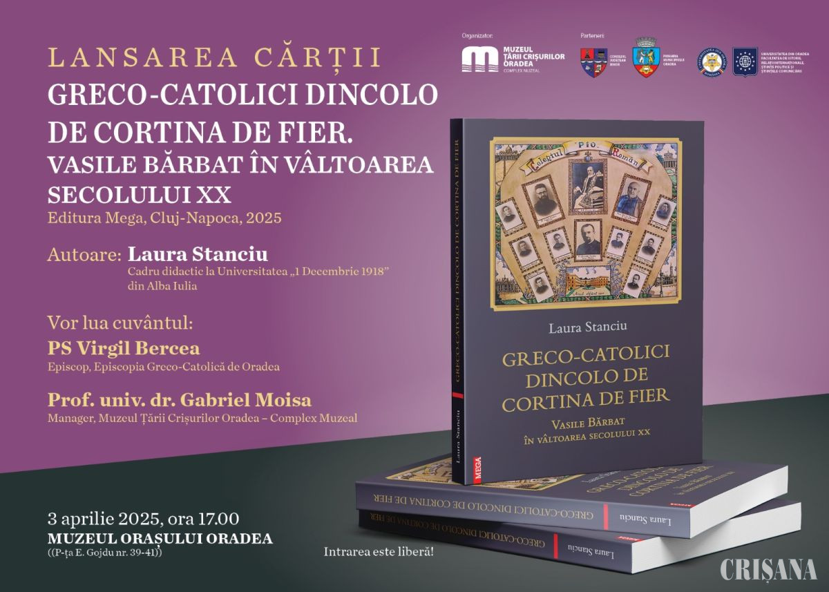 Muzeul Țării Crișurilor Oradea - Complex Muzeal, în parteneriat cu Consiliul Județean Bihor, Primăria Municipiului Oradea și Facultatea de Istorie, Relații Internaționale, Științe Politice și Științele Comunicării a Universității din Oradea, organizează lansarea cărții „Greco-catolici, dincolo de Cortina de Fier. Vasile Bărbat, în vâltoarea secolului XX”, autoare Laura Stanciu. Evenimentul va avea loc joi, 3 aprilie 2025, la ora 17.00, la Muzeul Orașului Oradea (P-ța. E. Gojdu nr.39-41).