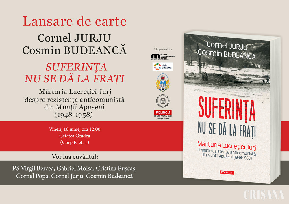 Muzeul Ţării Crişurilor organizează vineri, 10 iunie, lansarea volumului Suferinţa nu se dă la fraţi. Mărturia Lucreției Jurj despre rezistența anticomunistă din Munții Apuseni (1948-1958), de Corneliu Jurju și Cosmin Budeancă.