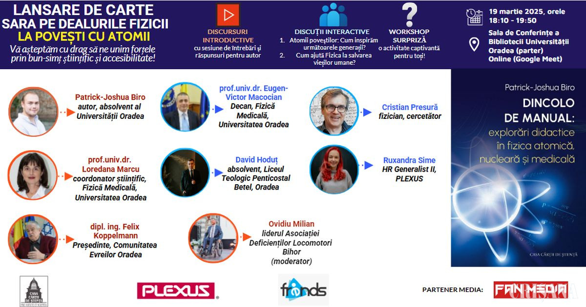 Biblioteca Universității din Oradea va găzdui, în 19 martie 2025, un eveniment unic pentru publicul general, dar mai ales pentru pasionații de știință. E vorba despre lansarea cărții „Dincolo de manual: explorări didactice în fizica atomică, nucleară și medicală”, scrisă de Patrick-Joshua Biro, un tânăr absolvent al specializării Fizică Medicală de la aceeași universitate.