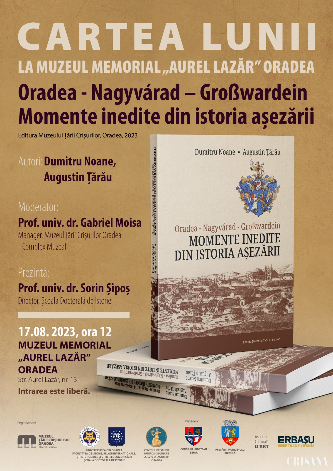 Muzeul Memorial „Aurel Lazăr” va găzdui joi, 17 august, la ora 12.00, lansarea cărții „Oradea – Nagyvárad – Großwardein. Momente inedite din istoria așezării”, scrisă de Dumitru Noane și Augustin Țărău și apărută la Editura Muzeului Țării Crișurilor. Evenimentul face parte din seria Cartea lunii.