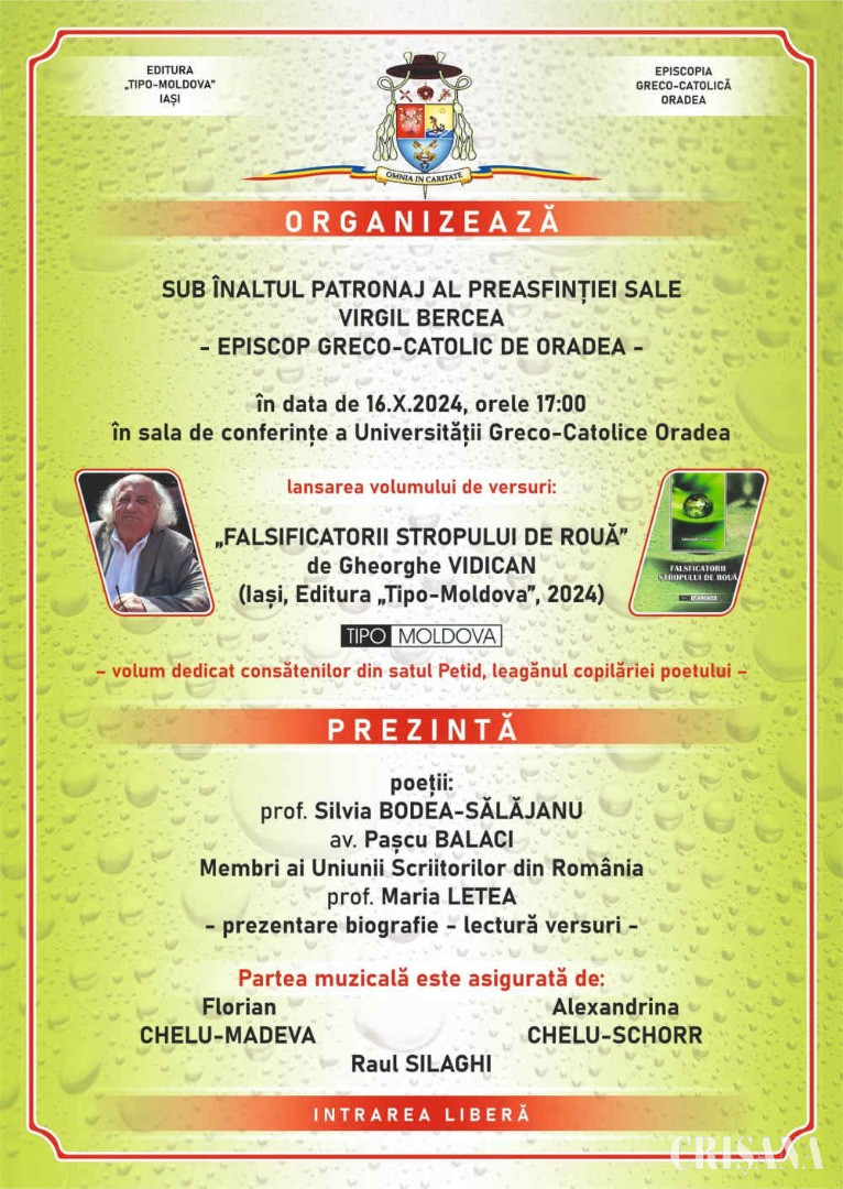 Sub înaltul patronaj al Preasfinției Sale Virgil Bercea, episcopul greco-catolic de Oradea, astăzi, 16 octombrie, de la ora 17.00, la Seminarul Teologic Greco-Catolic din Oradea, va avea loc lansarea volumului de versuri „Falsificatorii stropului de rouă”, apărut la Editura „Tipo-Moldova”, Iași, 2024, și semnat de poetul Gheorghe Vidican.