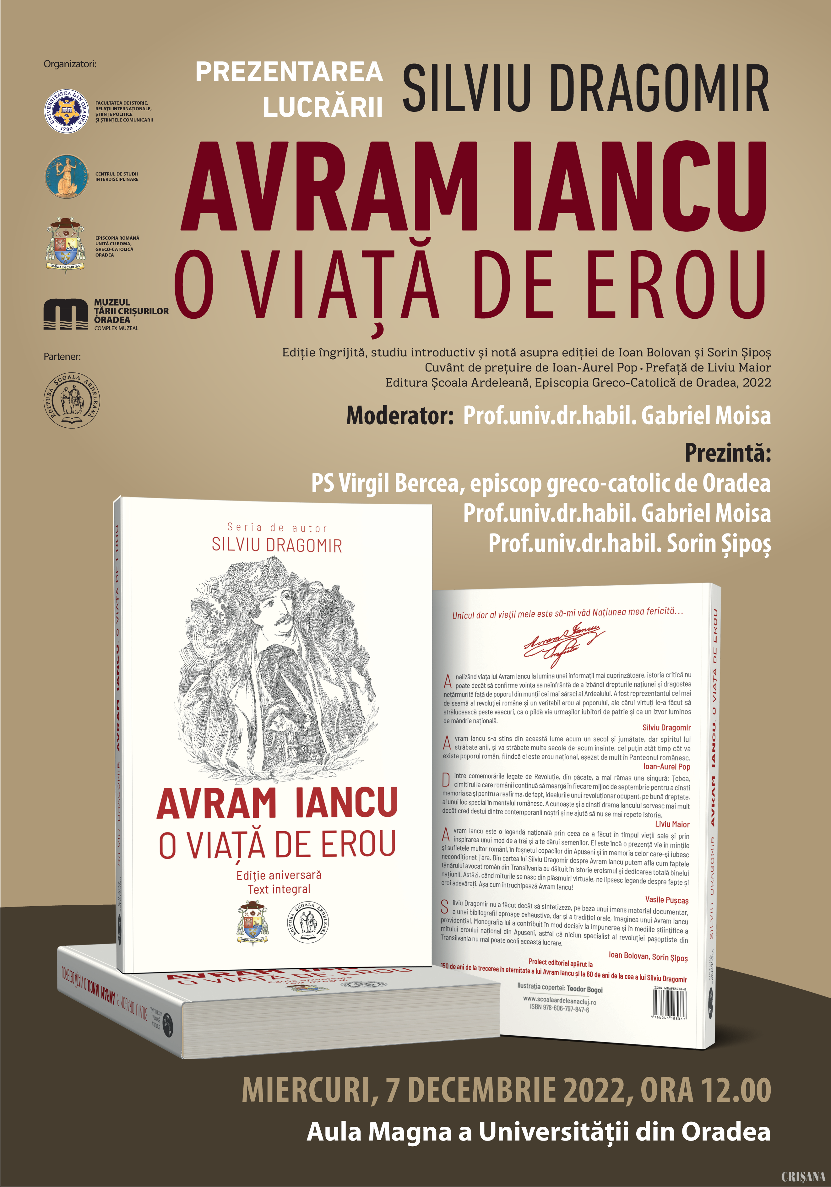 Aula Magna a Universității din Oradea va găzdui miercuri, 7 decembrie, de la ora 12.00, prezentarea lucrării „Silviu Dragomir, Avram Iancu - o viață de erou”.