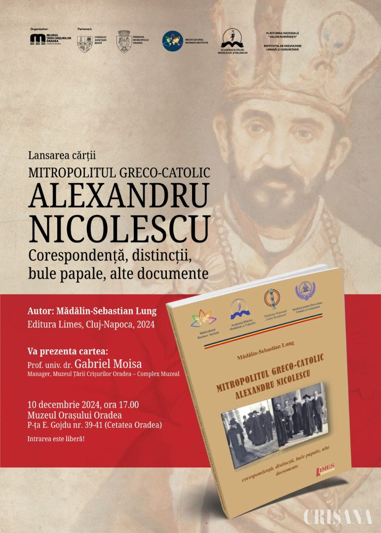 La Muzeul Orașului Oradea din Piața Emanuil Gojdu, nr. 39-41 (Cetatea Oradea), corp A - parter (Sala cu Grifoni) va avea loc, în data de 10 decembrie, ora 17.00, lansarea cărții „Mitropolitul greco-catolic Alexandru Nicolescu – corespondență, distincții, bule papale, alte documente”, avându-l ca autor pe tânărul cercetător Mădălin-Sebastian Lung.
