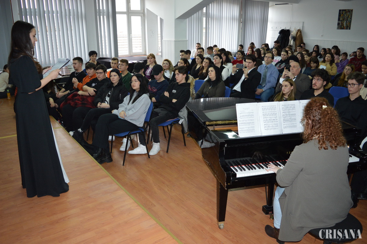 Săptămâna trecută, la Liceul de Arte s-au desfășurat două sesiuni de workshop, coordonate de Carmen Vasile, de la Universitatea din Oradea, cu profesorii și elevii de la canto. Ieri, în fața unei săli pline, aceștia au urcat pe scenă, aducând un frumos omagiu poetului Mihai Eminescu.