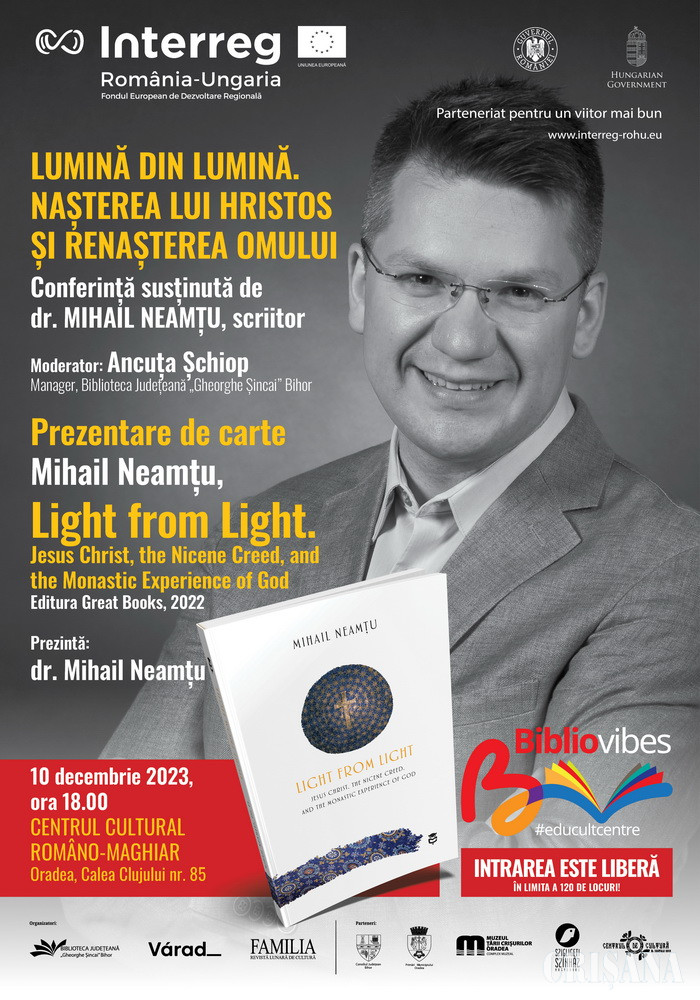 Conferința „Lumină din lumină. Nașterea lui Hristos și renașterea omului” va fi susținută de scriitorul și teologul dr. Mihail Neamțu, urmată de lansarea cărții „Light from Light - Jesus Christ, the Nicene Creed, and the Monastic Experience of God”, autor Mihail Neamțu, editura Marile Cărți, București, 2022, anunţă Biblioteca Judeţeană, printr-un comunicat de presă.