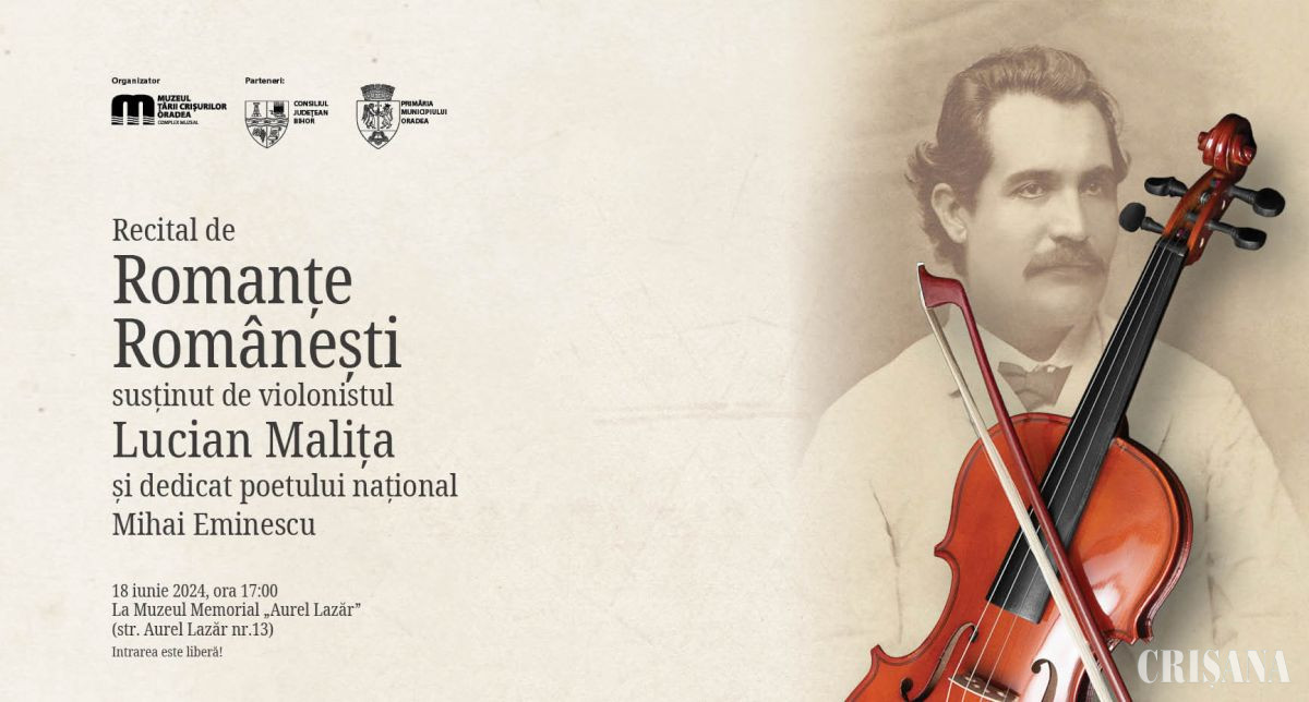 Muzeul Țării Crișurilor Oradea – Complex Muzeal, în parteneriat cu Consiliul Județean Bihor și Primăria Municipiului Oradea, organizează un recital de vioară dedicat poetului Mihai Eminescu, susținut de violonistul Lucian Malița. Evenimentul va avea loc în 18 iunie, de la ora 17.00, la Muzeul Memorial „Aurel Lazăr” (str. Aurel Lazăr nr. 13). În program: romanțe românești. Toți cei interesați sunt așteptați cu drag la eveniment! Intrarea este liberă.