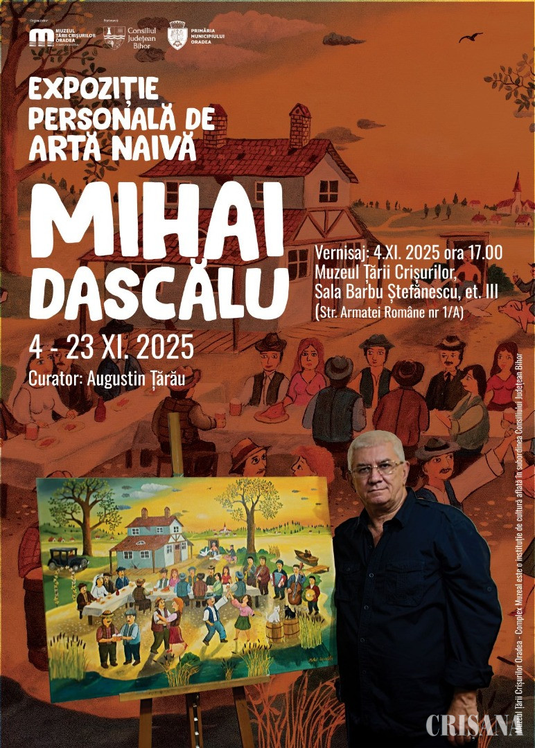 În Sala Barbu Ștefănescu a Muzeului Țării Crișurilor, marți, 4 noiembrie, de la ora 17.00, va avea loc inaugurarea expoziției personale de artă naivă a artistului Mihai Dascălu.