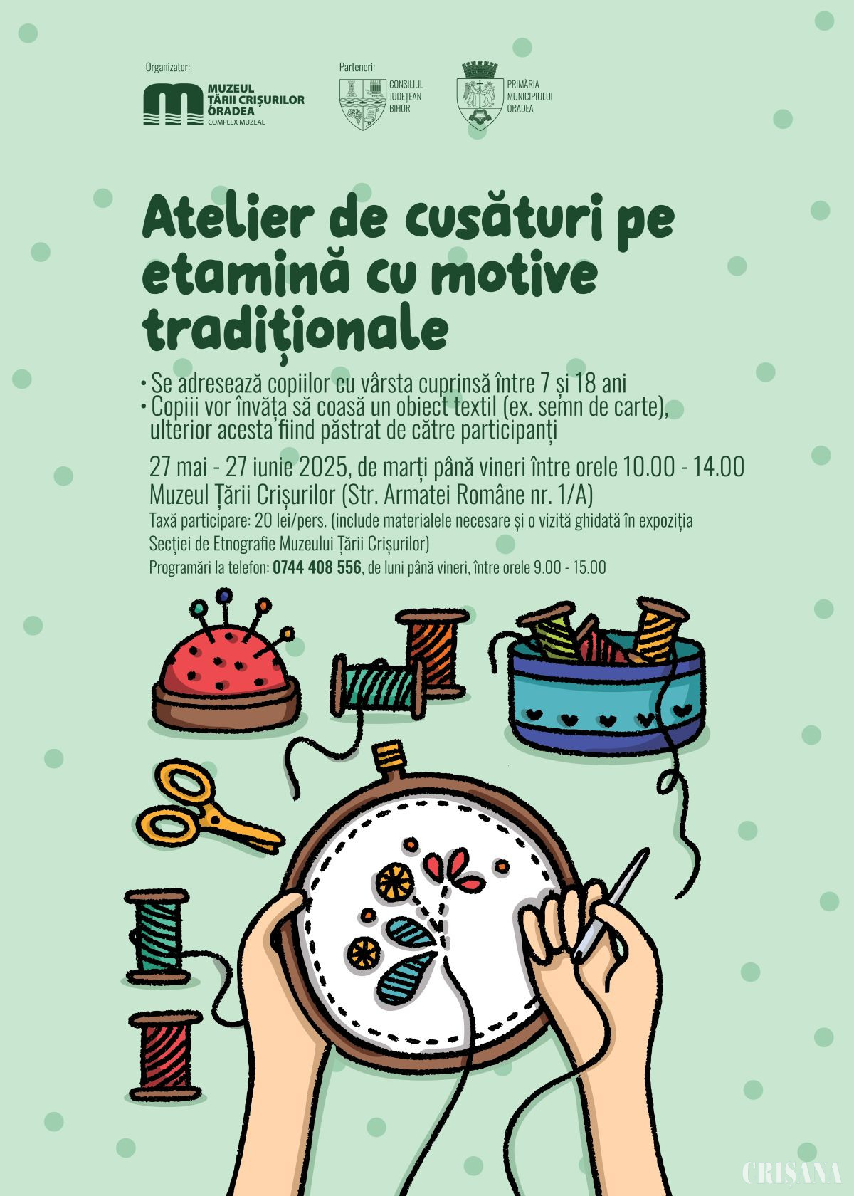 Muzeul Țării Crișurilor Oradea – Complex Muzeal organizează, în parteneriat cu Consiliul Județean Bihor și Primăria Municipiului Oradea, atelierul de cusături pe etamină cu motive tradiționale. Acesta este adresat copiilor cu vârsta cuprinsă între 7 și 18 ani și are ca scop promovarea motivelor tradiționale specifice textilelor din Țara Crișurilor. Copiii vor învăța să coase un obiect textil (ex. semn de carte) cu materiale puse la dispoziție de către Muzeul Țării Crișurilor, ulterior obiectul fiind păstrat de către participanți. Atelierele se vor desfășura la sediul instituției, strada Armatei Române nr.1/A, în perioada: 27 mai - 27 iunie, de marți până vineri, în intervalul orar 10.00-14.00. Taxa de participare este de 20 lei/copil și include și o vizită ghidată în expoziția Secției de Etnografie a Muzeului Țării Crișurilor.