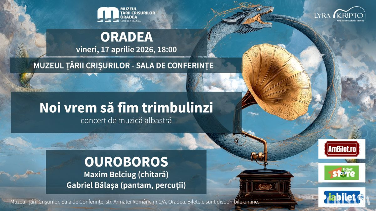 Intitulat „Noi vrem să fim trimbulinzi”, concertul extraordinar pe care Maxim Belciug și Gabriel Bălașa îl susțin vineri, 17 aprilie, la Oradea, are loc în Sala de Conferințe a Muzeului Țării Crișurilor (str. Armatei Române nr.1/A) și va începe la ora 18.00. Biletele sunt disponibile online, pe ambilet.ro, ticketstore.ro și iabilet.ro.