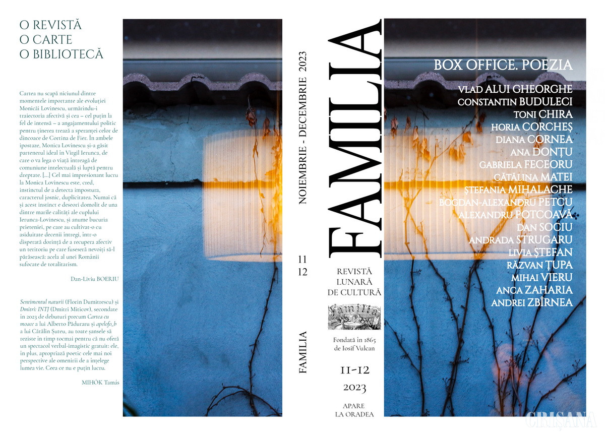 Dacă anul trecut grupajul „Box Office. Poezia” a adus laolaltă șaisprezece voci poetice eterogene, anul acesta, numărul lor a sporit cu doi. Protagoniștii sunt: Vlad Alui Gheorghe, Constantin Buduleci, Toni Chira, Horia Corcheș, Diana Cornea, Ana Donțu, Gabriela Feceoru, Cătălina Matei, Ștefania Mihalache, Bogdan-Alexandru Petcu, Alexandru Potcoavă, Dan Sociu, Andrada Strugaru, Livia Ștefan, Răzvan Țupa, Gabriela Vieru, Anca Zaharia și Andrei Zbîrnea. Ultimul dintre ei semnează și o cronică muzicală despre trupa budapestană Deposed Kings. O altă piesă de rezistență din rubrica artelor o reprezintă Cinemascop-ul Irinei-Roxana Georgescu despre „Anatomia unei căderi” (regia: Justine Triet, 2023), peliculă ce scoate la iveală „scurtcircuitele unui cuplu izolat de lume, care trece printr-o traumă severă odată cu accidentul în care băiatul lor rămâne orb”. Numărul 11-12 este ilustrat cu imagini ale artistei fotograf orădene Laura Flora.