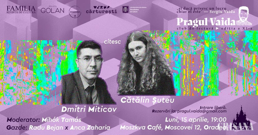 La ediția a 11-a a clubului de lectură Pragul Vaida, care va avea loc azi, la cafeneaua Moszkva, publicul orădean va avea ocazia să-i întâlnească pe Dmitri Miticov și Cătălin Șuteu, doi dintre poeții contemporani autohtoni cei mai nonconformiști din punct de vedere discursiv.