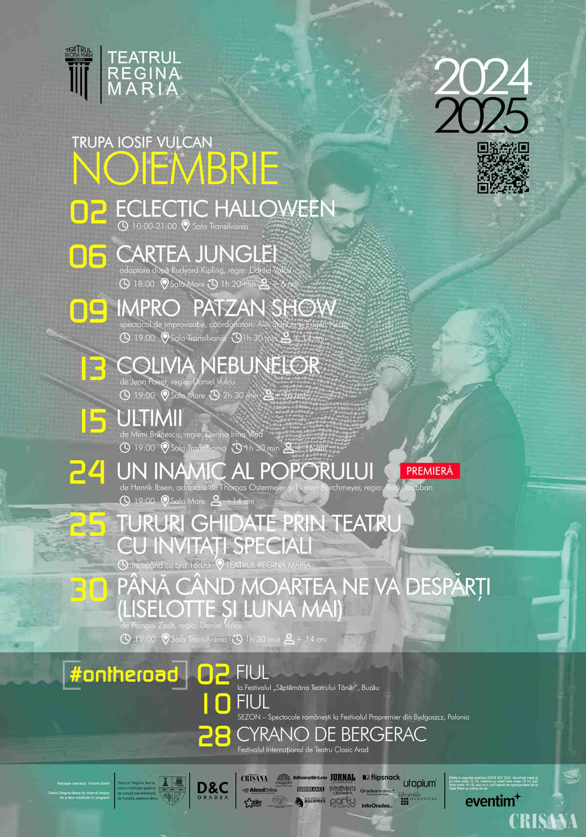 Programul lunii noiembrie la Teatrul Regina Maria cuprinde, pe lângă spectacole îndrăgite din repertoriu, un eveniment eclectic de Halloween, premiera spectacolului-debate „Un inamic al poporului”, un show de improvizație și tururi ghidate prin teatru cu invitați speciali, dar și deplasări în țară și străinătate.