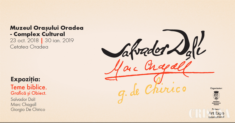 După un important succes în Letonia, Polonia și Lituania, Muzeul Orașului Oradea - Complex Cultural va găzdui expoziția „Salvador Dalí, Marc Chagall și Giorgio de Chirico: Teme biblice. Grafică și Obiect”. 91 de lucrări de grafică (litografie, serigrafie, în ediții numerotate), tapiserie și obiect (bijuterie, medalioane, medalii), în serii numerotate și autentificate, care evocă preocuparea artiștilor pentru temele biblice, interpretate în cheie, suprarealist, la începutul secolul XX.
