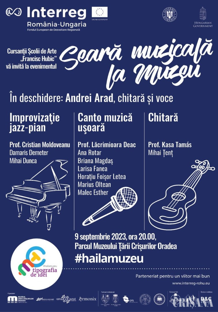 Tipografia de idei și Centrul de Cultură al Județului Bihor, prin Școala de Arte „Francisc Hubic”, îi invită pe orădeni la spectacolul „Seară muzicală la muzeu”, ce va avea loc sâmbătă, 9 septembrie 2023, de la ora 20.00, în parcul Muzeului Țării Crișurilor.