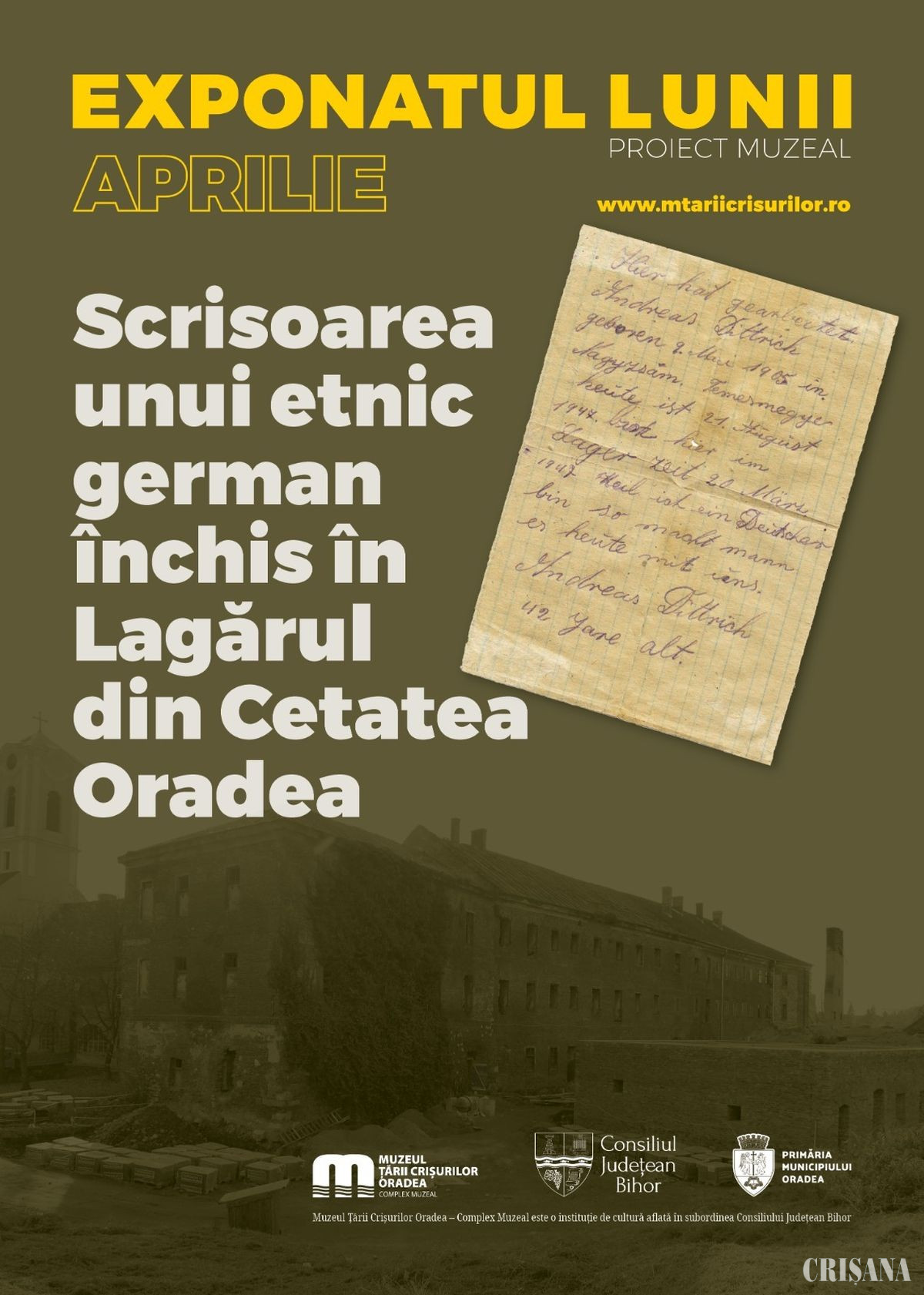 Exponatul lunii aprilie este „Scrisoarea unui etnic german închis în Lagărul din Cetatea Oradea”, obiect care va putea fi vizionat în perioada 1-30 aprilie și în intervalul orar 10.00-18.00, la Secția Muzeul Orașului Oradea (P-ța Mihai Viteazul nr. 39-41), Sala cu grifoni.