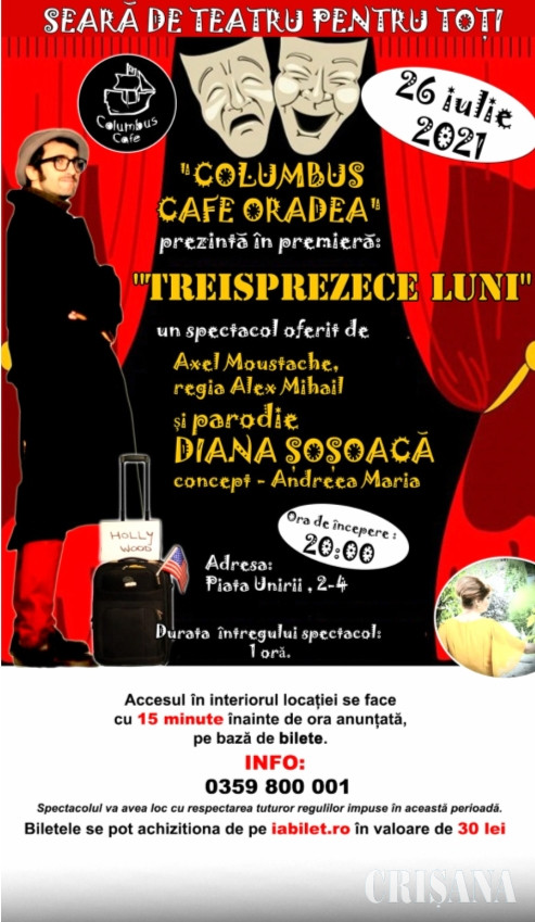Luni, 26 iulie, de la ora 20.00, orădenii sunt invitaţi să vizioneze spectacolul „13 luni”, o comedie despre visul american în regia lui Alex Mihail, al cărei protagonist este actorul Alex Moustache. Seara va fi completată de tânăra Andreea Maria care va prezenta o parodie care o are în prim-plan pe senatoarea Diana Şoşoacă.
