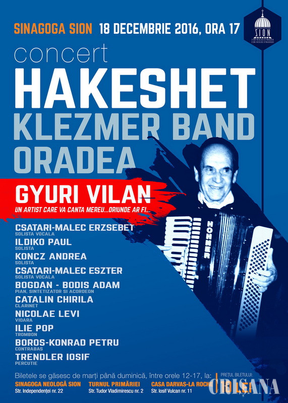 În data de 18 decembrie, la Sinagoga Zion din Oradea va avea loc un concert special al Hakeshet Klezmer Band Oradea. Concertul este dedicat celui care a fost fondatorul şi sufletul corului Comunităţii Evreilor din Oradea, artistul Gyuri Vilan.