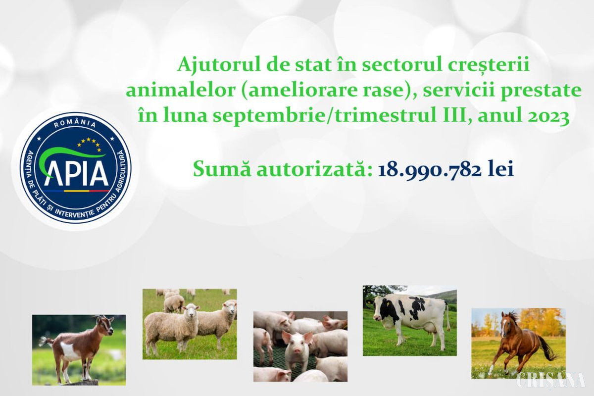 Agenția de Plăți şi Intervenție pentru Agricultură (APIA) a anunțat miercuri, 6 decembrie, că efectuează plata ajutorului de stat în sectorul creșterii animalelor (ameliorare rase), sumele aferente trimestrului III din 2023.