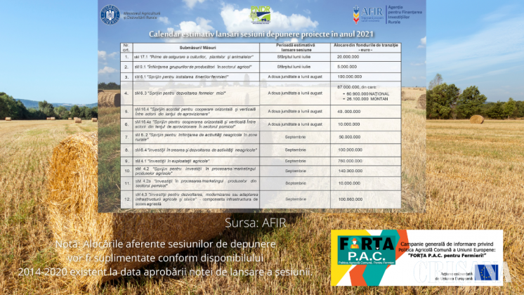 „Conform Regulamentului UE nr. 2020/2220 al Parlamentului European și al Consiliului pentru tranziția PAC, aprobat în data de 23 decembrie 2020, a fost extinsă aplicabilitatea cadrului legal existent pentru perioada 2021-2022, concomitent cu suplimentarea bugetului aferent Programului Național de Dezvoltare Rurală, având ca sursă principală, noul Cadru Financiar Multianual (CFM 2021-2027)”, arată o comunicare oficială a Comisiei Europene.