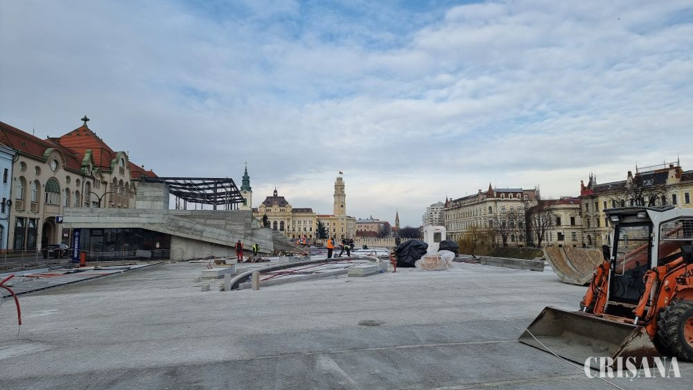 „În aceste zile au început lucrările de pavare a piațetei, pe o suprafață de peste 7500 mp, pavajul realizându-se din piatră naturală din granit auriu și cubeți de porfir. Stadiul fizic al lucrărilor totale este de 35%. Până în momentul de față, au fost efectuate lucrări de demolare, lucrări la structurile de rezistență a celor trei corpuri de clădire, s-au realizat lucrări la structurile de rezistență a esplanadei și zonelor de promenadă, lucrări de hidroizolare. De asemenea, s-au executat lucrări de instalații de preluare a apelor pluviale, s-au efectuat lucrări de instalații sanitare - oglinda apei, lucrări de instalații fântâni arteziene, lucrări de instalații HVAC, s-au executat lucrări de instalații electrice exterioare, precum și de instalații electrice și sanitare interioare la corpurile de clădire, împreună cu lucrări de placare cu pavaj de piatră naturală din granit auriu”, se arată într-un comunicat al Primăriei Oradea.