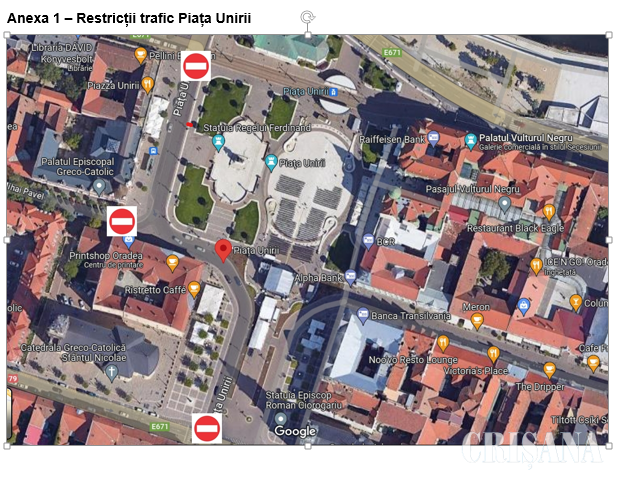 De asemenea, în week-endul 16 - 18 iunie, când vor avea loc activități și concerte în cadrul evenimentului Sounds of Oradea Festival, va fi interzis accesul autoturismelor în Piața Unirii în data de 16 iunie, între orele 19.00 și 23.30, precum și în data de 18 iunie, în același interval orar. Sâmbătă, 17 iunie, va fi permisă circulația autovehiculelor în Piață.