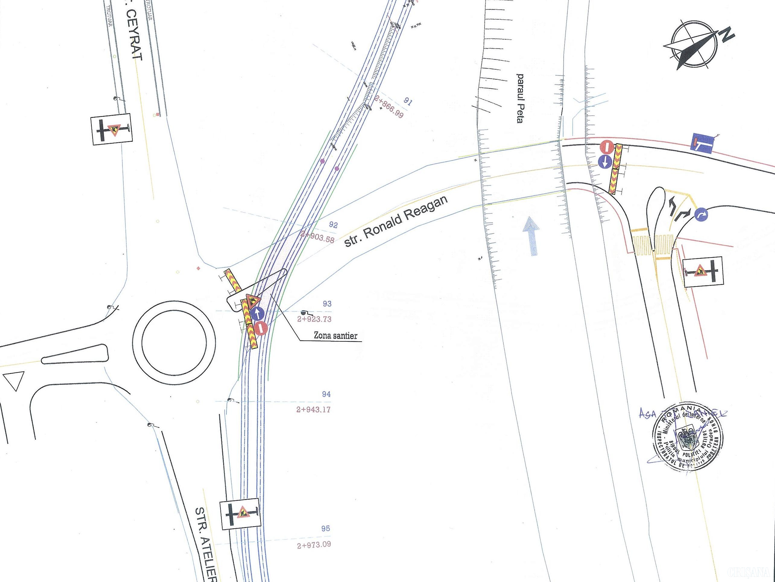 „Având în vedere lucrările de traversare cu linia de tramvai la intersecţia cu strada Ronald Reagan, este necesară devierea circulației, deoarece în această perioadă vor avea loc lucrări de pregătire a infrastructurii feroviare, de montare a traverselor şi a şinelor, urmate de turnarea dalei de beton armat şi asfaltare. Până în prezent s-a executat legătura liniilor de tramvai pe următoarele direcții: intersecția între străzile Primăriei - Decebal - Calea Aradului și intersecția dintre străzile Aviatorilor - Calea Aradului. Acum sunt în execuție lucrările de realizare a liniei de tramvai în zona străzilor Făgărașului, Ceyrat și în depoul OTL. În continuare se va finaliza linia de tramvai și montarea firului de contact în zona străzilor Ceyrat, Atelierelor și de la Depoul Salca până la intersecția cu str. Dimitrie Cantemir, montarea celor două stații de redresare pentru alimentarea cu energie electrică a liniilor de tramvai și montarea adăposturilor pentru stațiile liniilor de tramvai”, precizează Primăria Oradea.