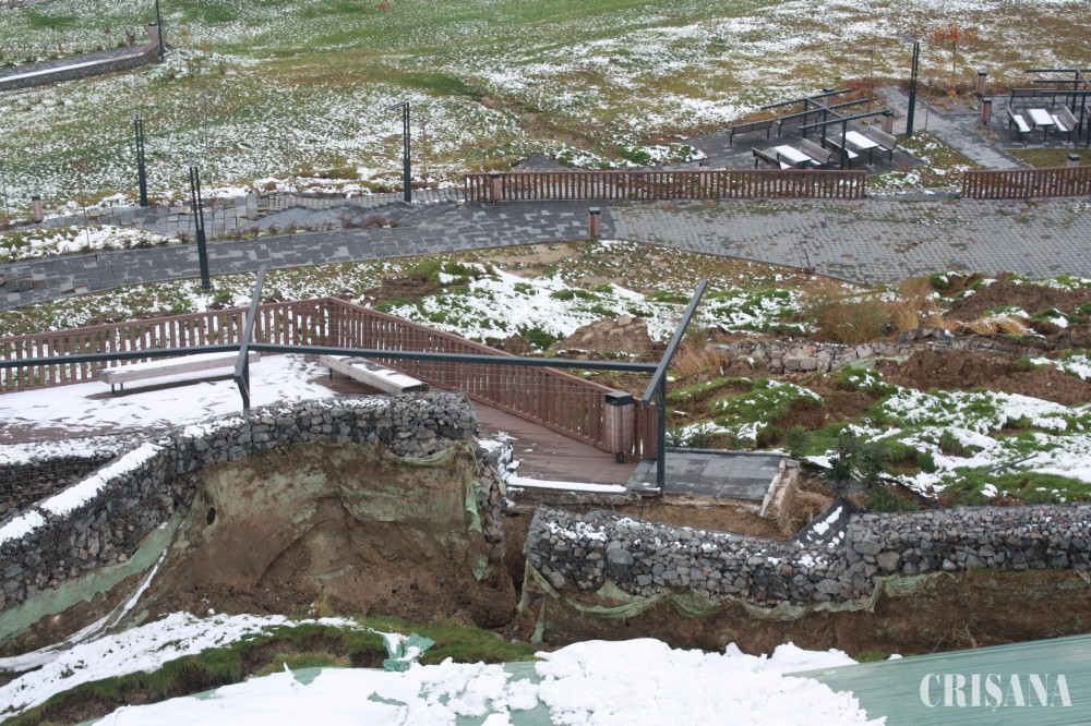 Deasemenea, s-a constatat că partea de drenaj la amenajarea versantului, deci preluarea apelor, a fost rezolvată superficial, în așa fel încât o parte din apa pluvială colectată de pe versant din zona gabioanelor de pe alei a contribuit la instabilitatea și alunecarea versantului. Baza gabioanelor a fost sub nivelul terenului, astfel că apa infiltrată s-a acumulat la baza acestora, facilitând infiltrarea ei în terenul friabil.
