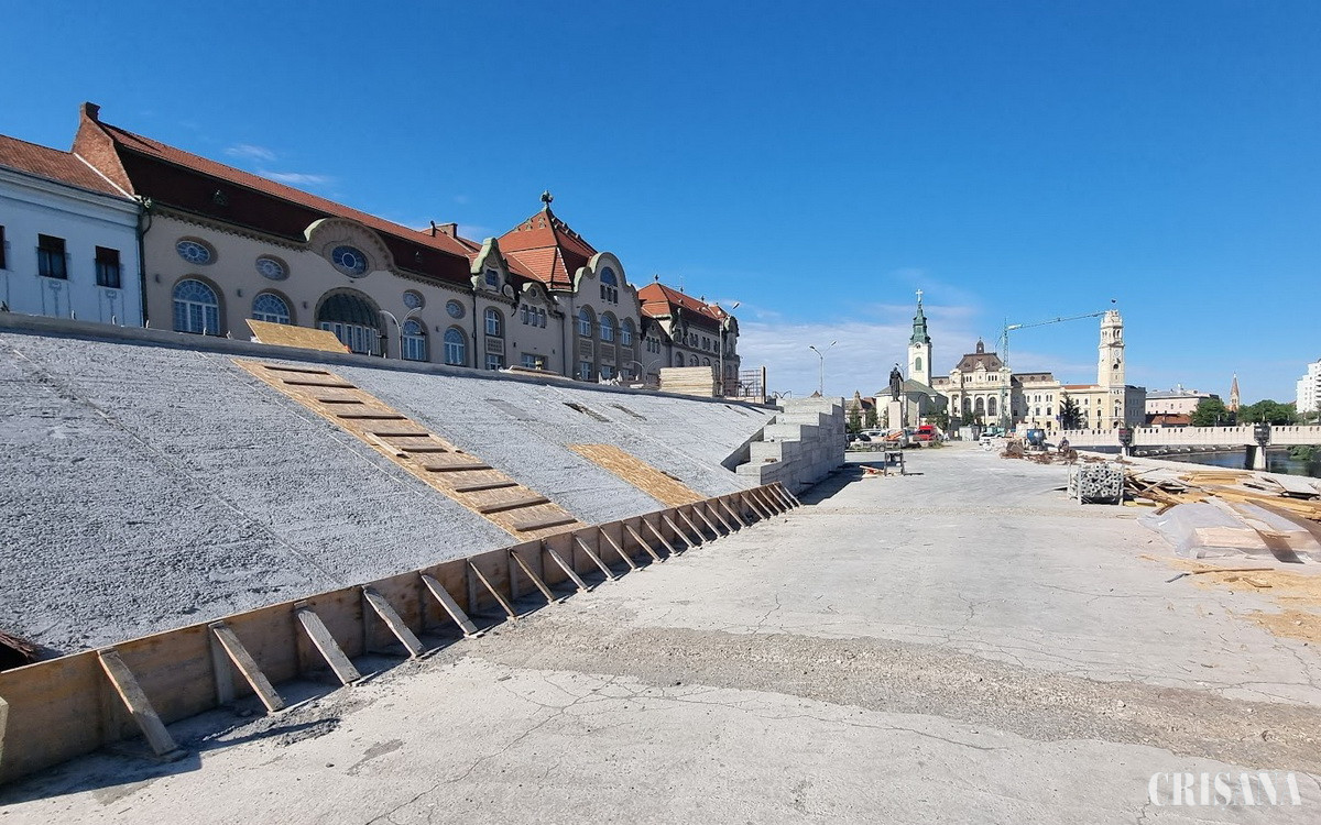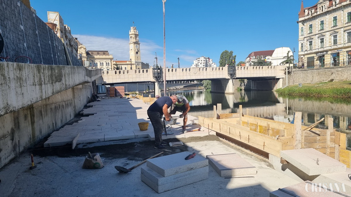 „Dinspre Podul Sf. Ladislau spre Sinagogă a început placarea zidului de sprijin al malului și a pereților parcării subterane, pavarea treptelor și a platformei pietonale. Placarea se face cu plăci de granit auriu și cubeți de porfir. După finalizarea acestora, va urma montarea balustradelor și amplasarea mobilierului urban”, precizează Primăria Oradea.