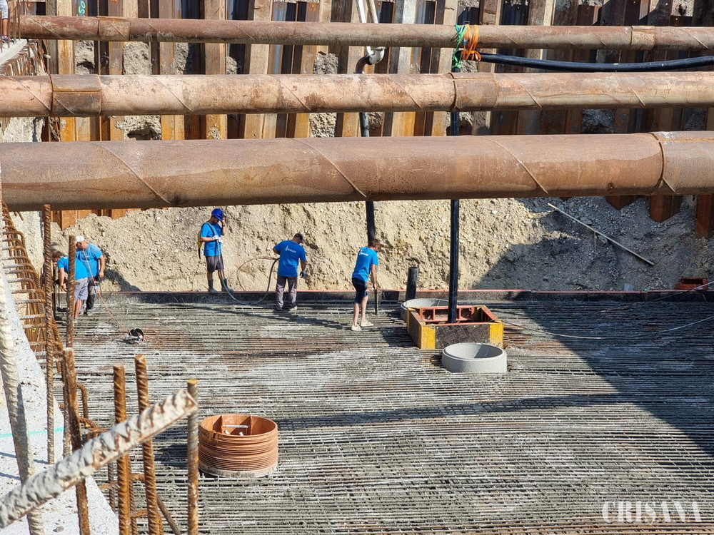 500 de metri cubi de beton au fost turnați luni, 8 august, la radierul pasajului din Piața Cetate. Urmează turnarea pereților de etanșare situați sub grinzile pasajului și armarea rampei dinspre cartierul Nufărul.