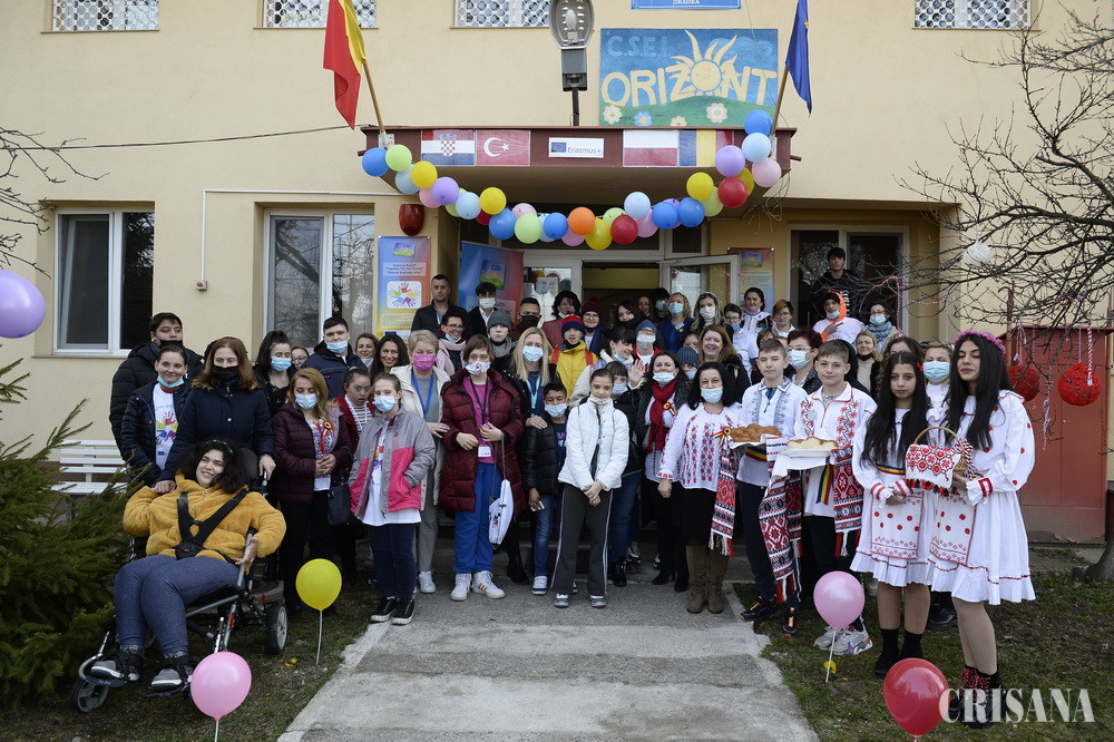 În cadrul proiectului Erasmus "Together We Are Strong", profesori și elevi de la instituțiile școlare partenere, reprezentanți ai Consiliului Județean Bihor și ai IȘJ Bihor au fost întâmpinați joi, 3 martie, cu pâine și sare la intrarea în Centrul Școlar de Educație Incluzivă "Orizont" Oradea.