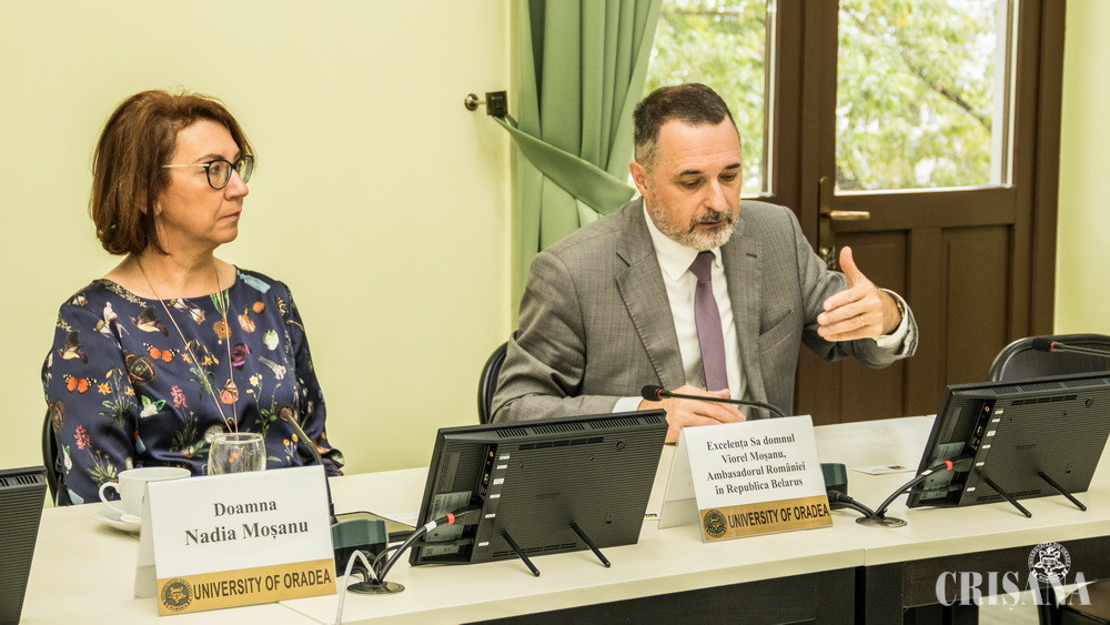 Impresionat de prezentarea făcută, Excelența Sa Viorel Moșanu, ambasadorul României în Belarus, a spus că, în condiții normale, ar fi venit la Universitatea din Oradea pentru a strânge relațiile academice dintre cele două țări. „Dar, din nefericire, în țara în care îmi îndeplinesc misiunea diplomatică lucrurile au deraiat periculos. De un an de zile, țara este într-o criză politică internă gravă. Este o dramă, fiindcă nu credeam că vom fi martorii unei asemenea degradări a situației într-o țară profund europeană”. Moșanu, al cărui discurs a fost vizibil marcat de o adâncă tristețe pentru situația din țara condusă de Aleksandr Lukașenko, a pus criza politică pe seama „dorinței de a rămâne la putere, cu orice preț”. Ambasadorul român a afirmat că regimul de la Minsk a decapitat societatea civilă și că represiunea a fost atât de eficientă încât, practic, mișcarea de protest, declanșată acum un an, a dispărut. „În acest moment totul s-a năruit. Mai mult decât atât, rectori ai unor universități belaruse au participat la represiune împotriva propriilor studenți”, a spus Moșanu. Soția sa, Nadia, a detaliat: „Și-au pârât studenții deoarece cântau cântece de protest pe holurile universităților”. S-au făcut numeroase arestări și, după cum spune Moșanu, la Minsk, s-a pus la cale un proces model menit să discrediteze mișcarea studențească și să demonstreze că studenții sunt manipulați din afară. Doar pentru că au cântat cântece îndreptate împotriva regimului Lukașenko, câteva zeci de studenți belaruși au fost condamnați la doi ani și jumătate de închisoare, alții au fost exmatriculați, unii au plecat la studii în Polonia, Lituania sau Germania.